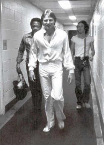 Greg Lake walks to the stage, accompanied by bodyguard Ernst Mohamed